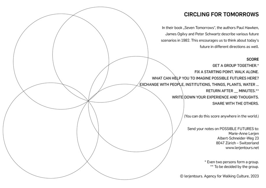 From 3 to 9 July 2023, the third Walking Arts Encounters/Conference will take place in Prespa, Greece. Walking artists from all over the world meet to exchange ideas. This year under the focus "Walking Visions/Visions for Walking". lerjentours is involved for the third time. In 2019, lerjentours participated on site with the walk 'Walking Ruins', in 2021 she co-organized the HUB Zurich, in 2023 she is present with the score "Circling for Tomorrows".