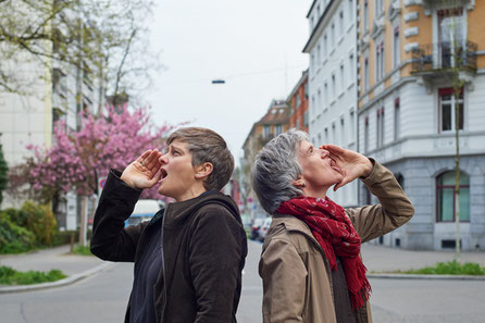 “Echo" walk in two groups through the city center in collaboration with artist Ida Dober. The two performers «juchz»